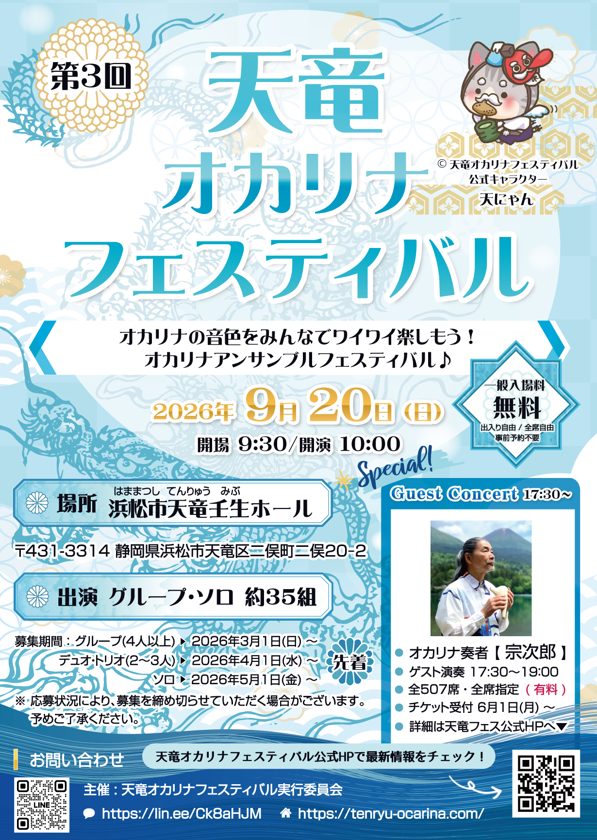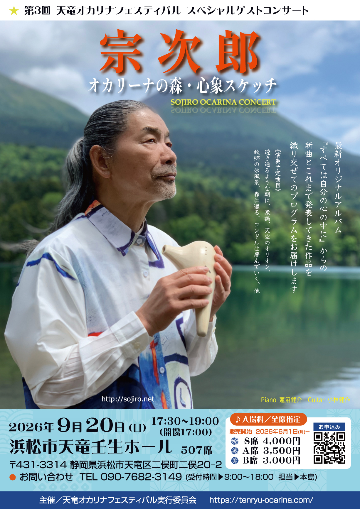 | 内 容 | ● オカリナアンサンブルフェスティバル 10:00~16:30(開場 9:30) 観覧無料 ● スペシャルゲストコンサート ゲスト:宗次郎(https://sojiro.net/) 17:30~19:00 (開場 17:00) S席 4,000円 A席 3,500円 B席 3,000円 チケット販売開始 2026年6月1日(月)~ |